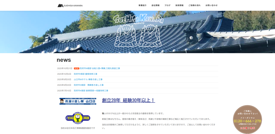 末久瓦店(すえひさかわらてん)は、山口県防府市を拠点に屋根工事・雨漏り修理を専門とする地域密着の屋根リフォーム会社です。1997年の創業以来、28年以上にわたり培った経験と技術で、数多くの屋根工事を手掛けてきました。