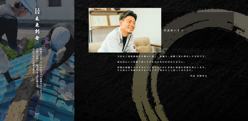 未来創舎は、三重県鈴鹿市に拠点を置く地域密着の屋根工事・雨漏り修理専門業者です。一級瓦技能士の資格を持つ職人が在籍しており、高い技術力と経験を活かして住まいの屋根を守ります。