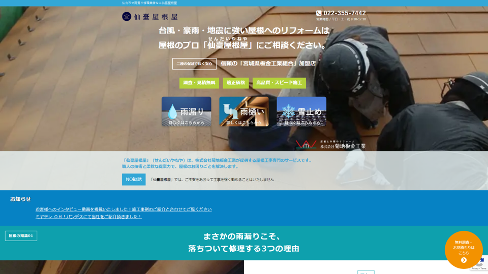 なごみルーフは、地元宮城に根付く屋根修理専門店です。小さな修理はもちろん、屋根カバー工法や葺き替え、屋根塗装や雨樋交換などを得意とする会社です。 それぞれの工事に専門の職人が在籍し、日本瓦やスレート、トタンやガルバリウムなどのあらゆる金属系屋根の修理に対応できます。積水などのハウスメーカーや地元工務店で建てた物件、アパートや工場の屋根でも、屋根の事ならどんな事でも対応できる屋根修理のエキスパート集団です。大手出身の一級建築士が顧問を務めており、住宅の骨格に合った屋根材を100種類以上の中から選択し、お客様のご要望に合った提案することができます。