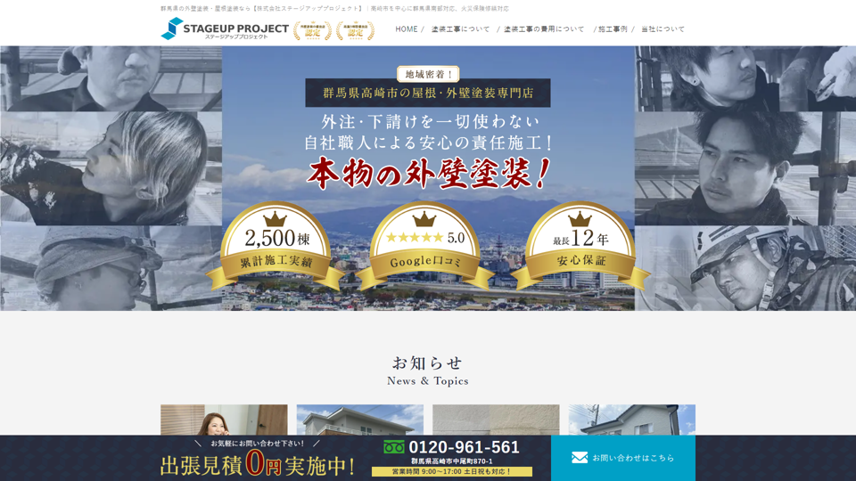 株式会社ステージアッププロジェクトは、高崎市を中心に群馬県南部で2,500件以上の施工実績を持つ外壁塗装・屋根塗装専門店。