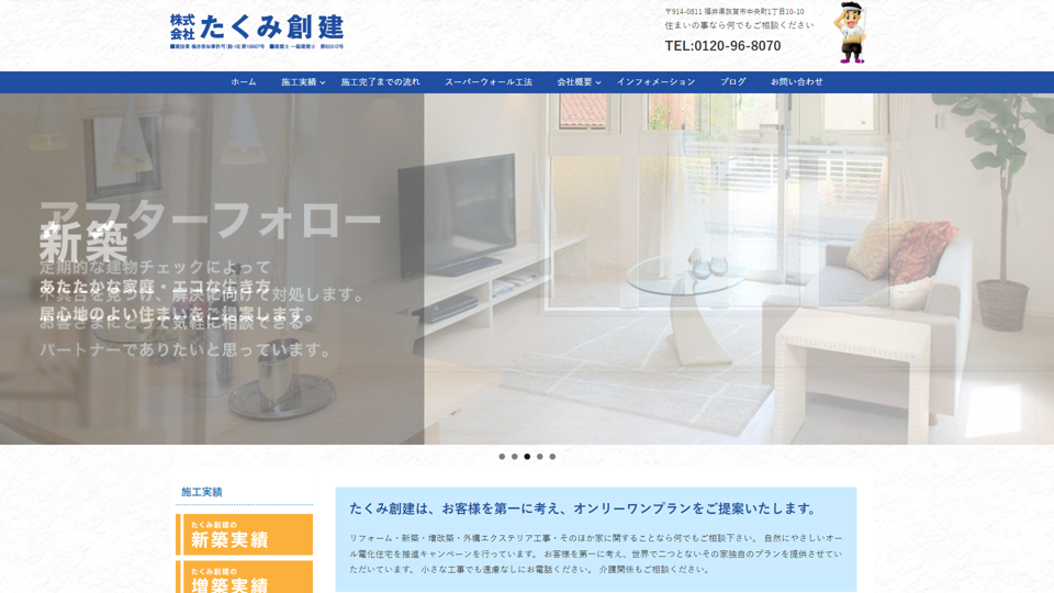 福井県敦賀市の株式会社たくみ創建は、新築からリフォーム、内外装や水回りの施工まで、幅広い建築実績を誇る一級建築士事務所。