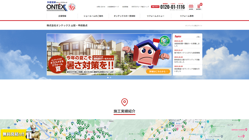 株式会社オンテックスは、山梨県甲府市を拠点に、山梨県内の広範囲(甲府市、富士吉田市、甲州市など)で累計600件以上の施工実績を持つ外壁塗装専門店。
