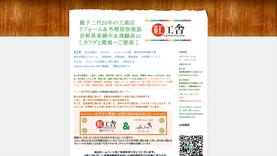 紅工舎は、長野県東御市と岐阜県高山市で親子二代55年にわたり信頼される工務店として外壁屋根塗装を手がける会社です。