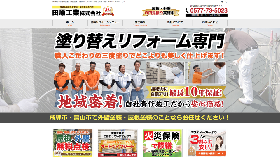 田原工業株式会社は、2011年の創業以来、岐阜県飛騨市・高山市を中心に活躍する塗り替えリフォーム専門店。