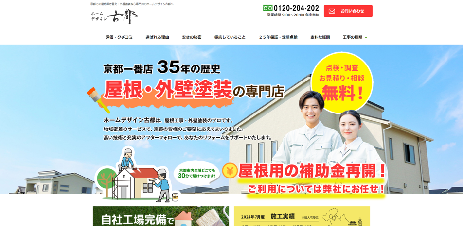 ホームデザイン古都は、京都で35年以上の歴史をもつ老舗の屋根修理・外壁塗装の専門業者です。お客様の大切な資産である家を守ることを使命と心得に、質の高いサービスと親切・丁寧な説明を行っています。