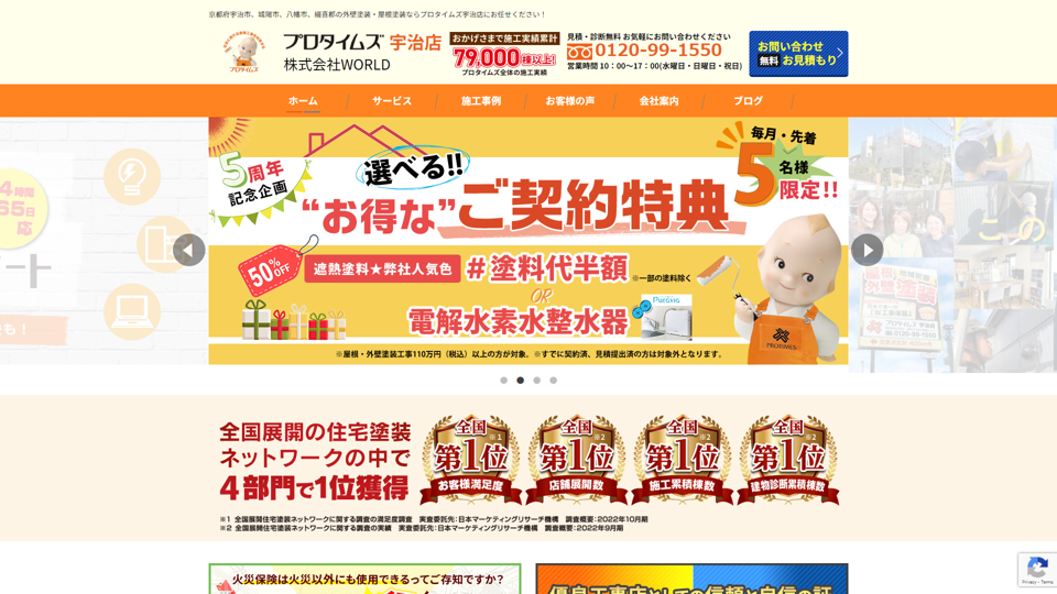プロタイムズ宇治店(株式会社WORLD)は、京都府宇治市を中心に200例以上の実績を持つ外壁塗装・屋根塗装専門店。