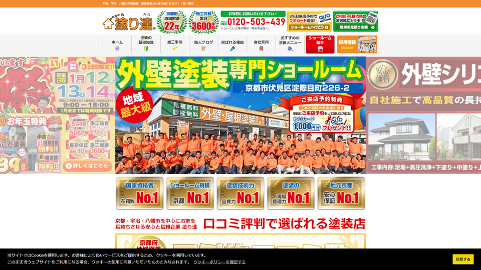 株式会社植田(塗り達)は、京都市、宇治市、八幡市を中心に3,600件以上の施工実績を目指す外壁塗装、屋根塗装専門店。