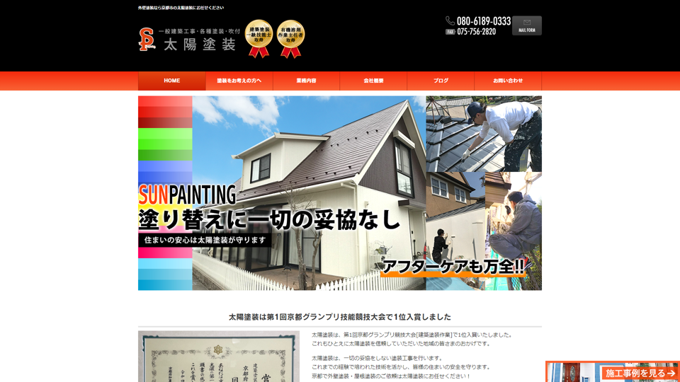 京都市を中心とした関西一円を対応エリアとする太陽塗装は、外壁塗装・屋根塗装・防水塗装・シーリング工事などを手がける専門店。