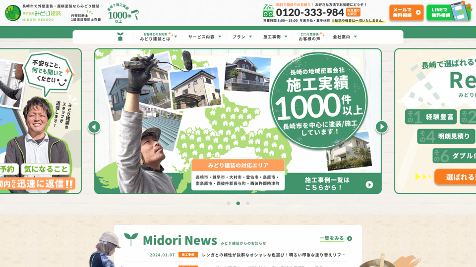 みどり建装は、長崎市を中心に1,000件以上の施工実績を持つ外壁塗装・屋根塗装専門店。