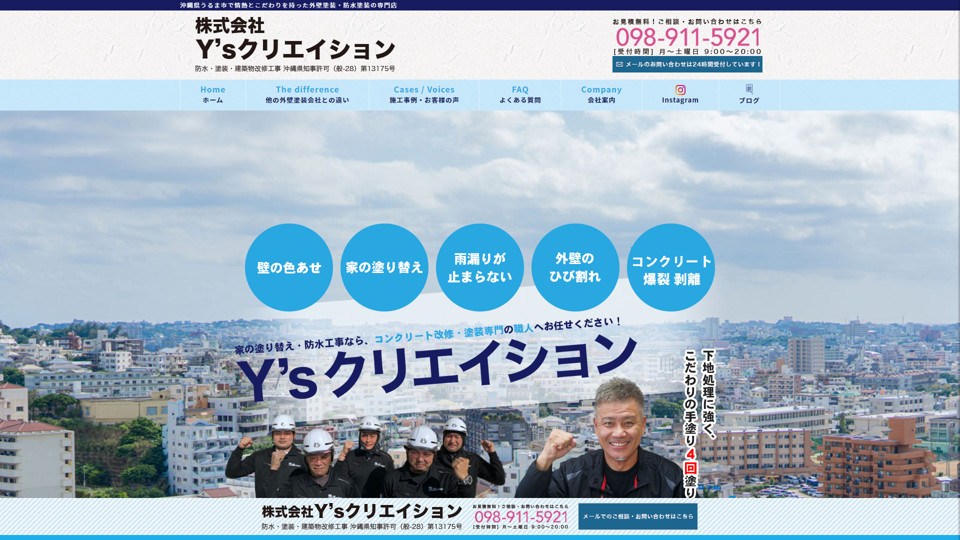沖縄県うるま市での実績が豊富な株式会社Y’sクリエイションは、創業10年以上の経験を持つ外壁塗装・防水塗装専門店。