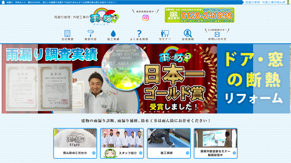 雨漏り修理・外壁工事の雨ん防-あめんぼは、会社の拠点を山形県山形市に置いており、雨漏りを専門にしている会社です。