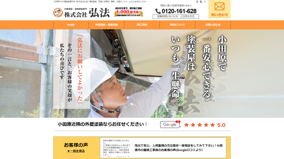 株式会社弘法は、小田原市を拠点として累計1,000棟の施工実績を持つ外壁・屋根塗装専門店。