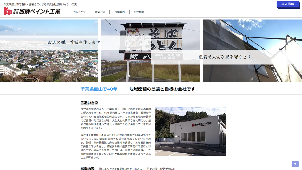 株式会社加納ペイント工業は、千葉県館山市を中心に40年にわたり地域密着形の営業を続けている塗装と看板の専門会社。